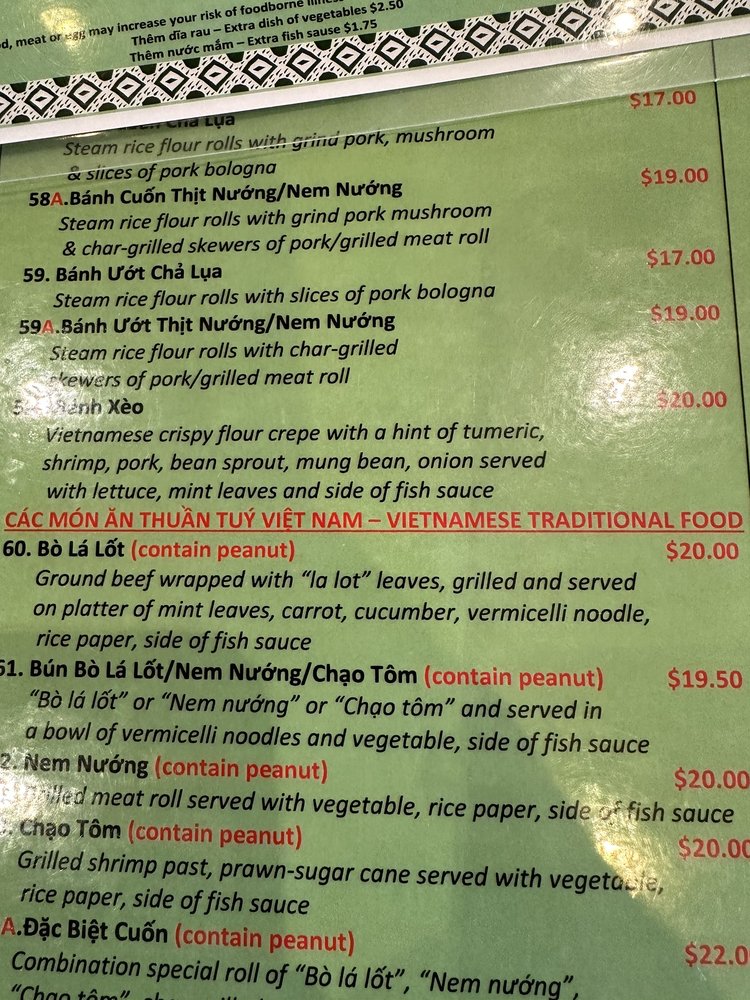 Ground beef wrapped with "la lot" leaves, grilled and served on platter of mint leaves, carrot, cucumber, vermicelli noodles, rice paper, side of fish sauce